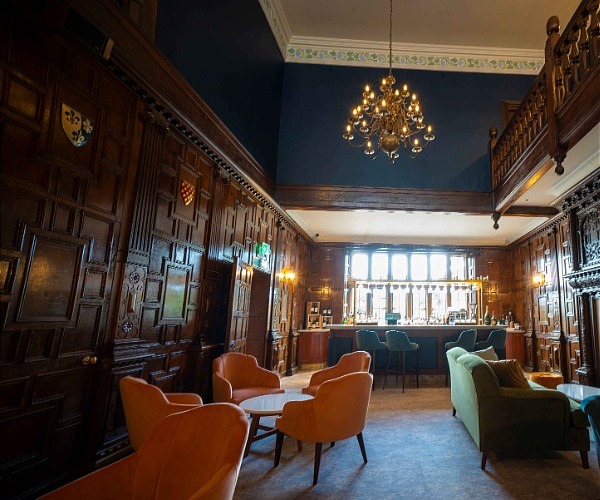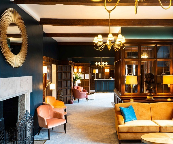 Gins from the local Shakespeare Distillery feature in a well-stocked bar. Oak panelling dating from the sixteenth century, featuring heraldic crests, surrounds a large log-fire.