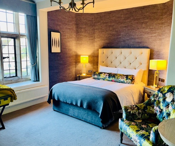 A sturdy fire door and deep-pile carpets insulate our wing from any hubbub around reception and the bar. Room 1, of yesteryear generous proportions but with contemporary styling, looks across the courtyard to parkland. Two vibrantly floral armchairs are strategically positioned for serene rural views.