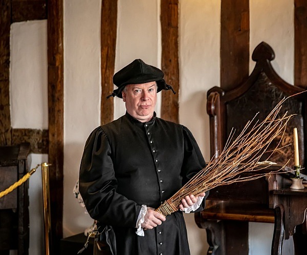 A school-master menacingly equipped with a birch, talks visitors through a curriculum of bible study and the classics. Shakespeare’s ambitious wheeling-dealing father, hoped that young Will would become a lawyer. History records that 12 travelling groups of players visited the Guild Hall during Shakespeare’s schooldays and it is their performances which seemed to have the greatest impact on Shakespeare.