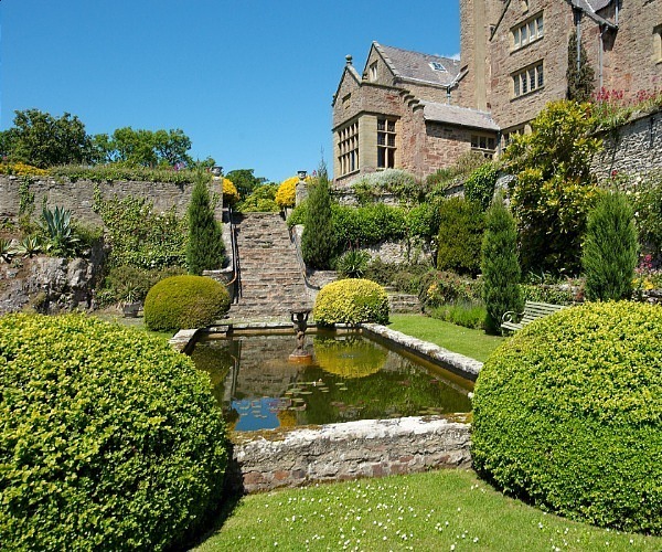 Through the descending terraces, the gardens flow from formal, lily pond and roses, to lawns and woodland.