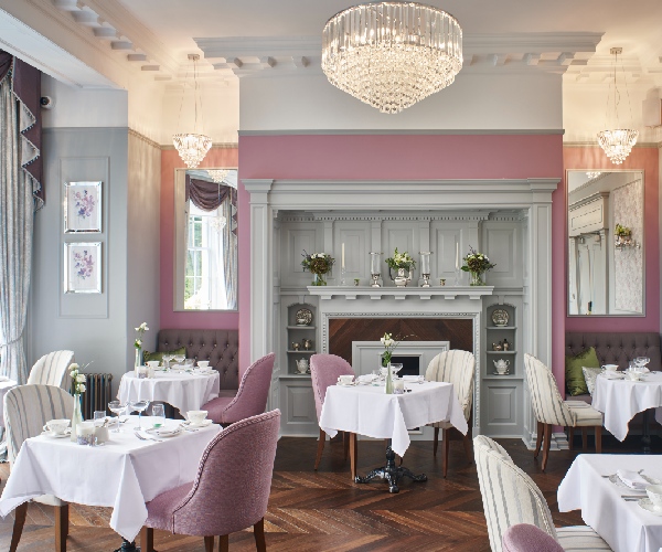 Afternoon tea is both an art and a science when it is served in the dove grey Tea Room. Beneath the glittering chandeliers, Georgian elegance is given a lighter touch by with soft furnishings and crockery from Laura Ashley. A trio of silver tea-pots displayed on a shelf remind guests that this is a room dedicated to afternoon tea. Soft plum draped window scarves top towering silver curtains which frame serene views across the lawn.