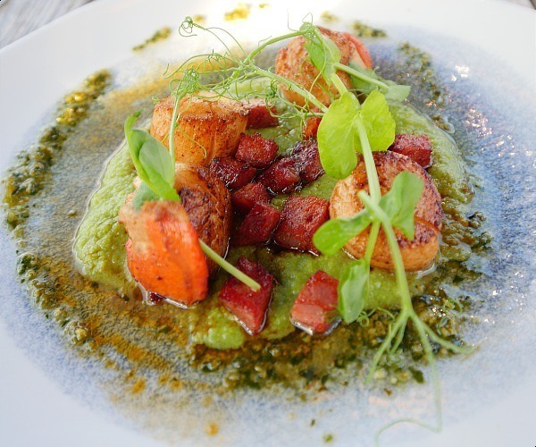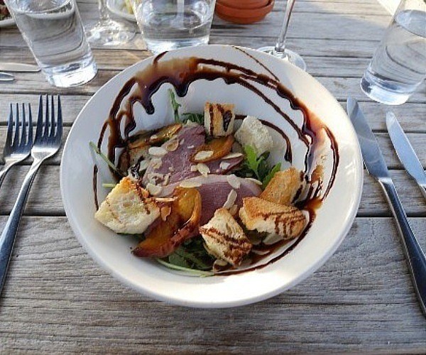 We had the most delicious dinner during our stay. Our starters were the pan-seared Brixham scallops, beautifully-succulent and presented with a pea purée, basil pesto and chorizo, and the smoked duck breast, with peaches, rocket and toasted almond panzanella salad, and a balsamic glaze.