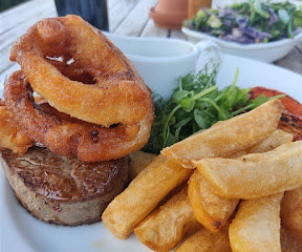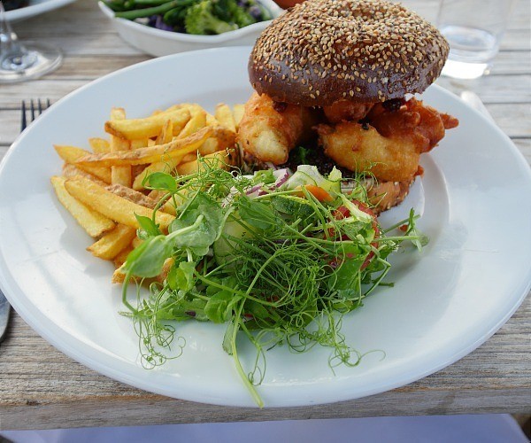 For our mains, we had the West Country fillet of beef, cooked just to my liking (rare) with hand-cut chips, onion rings, tomato, mushrooms and peppercorn jus and, from the specials, a delicious battered monkfish burger with a chorizo jam, garlic mayonnaise, fries and a mixed leaf salad.
