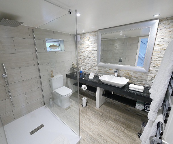 The bathroom in our beach hut, also on the ground floor, has a large walk-in rainfall shower.