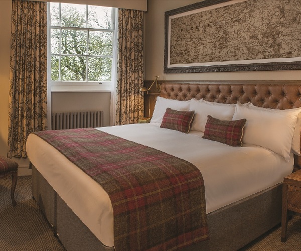 Overlooking rolling acres of mature parkland, the first-floor suite is one of 12 that makes up the 87 rooms available in the mansion house. A high-ceilinged bedroom and lounge recall spacious, lordly living from a bygone age. An antiquarian map of Berkshire stretches out above the tan leather headboard.
