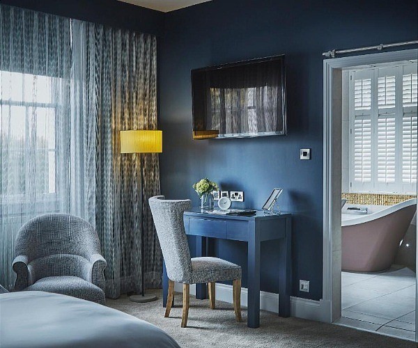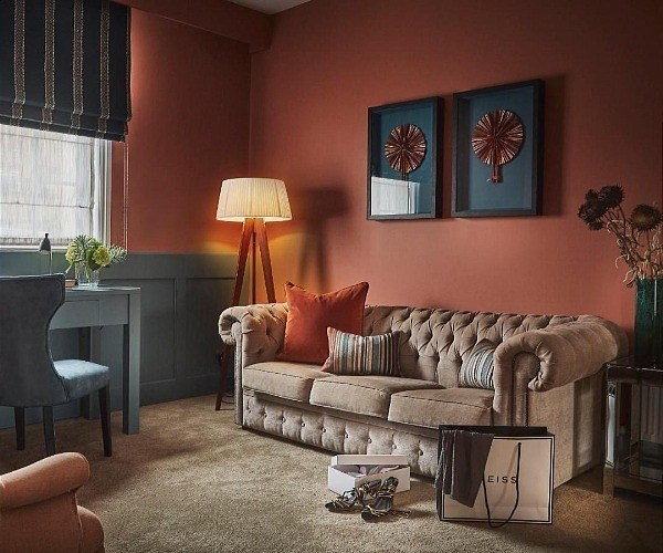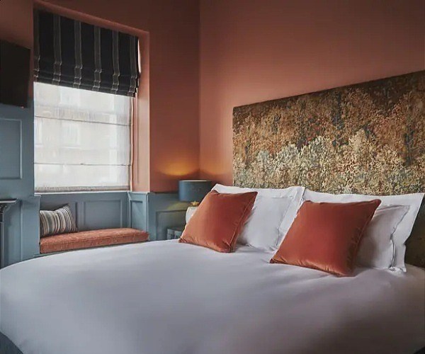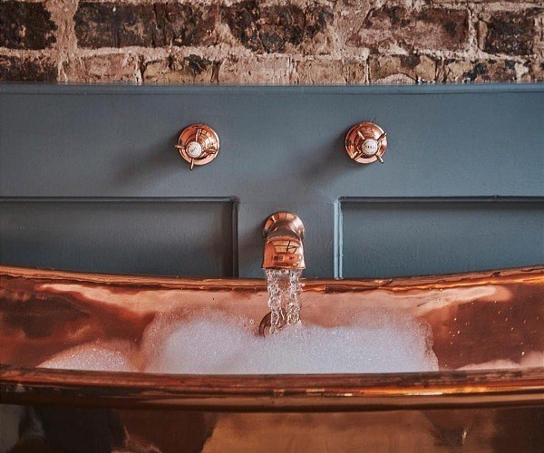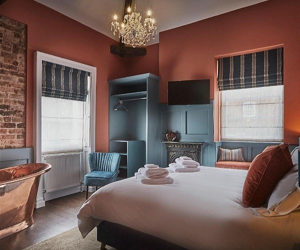 The Aubergine Room (Bedroom 3) with its striking aubergine curtains and sofa, The Blue Room (Bedroom 4) and The Copper Suite (Bedroom 5), with its own living space and eye-catching copper bath set against exposed brickwork, are the remaining rooms on this floor.