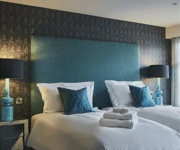 The Roman Room (Bedroom 6) has a king-sized bed and headboard set against a feature wall with wallpaper depicting the heads of Roman emperors with mirrored bedside tables and bold lampshades either side. Pictures of Roman urns on the walls and an antique mirror depicting a Roman goddess, combined with emerald tones, a sofa and dressing table, complete the look.