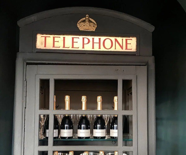 A telephone box that houses a Husky fridge and shevling for multiple Champagne flutes and ice buckets serves as a reminder that this special house serves as the perfect venue for a celebration.