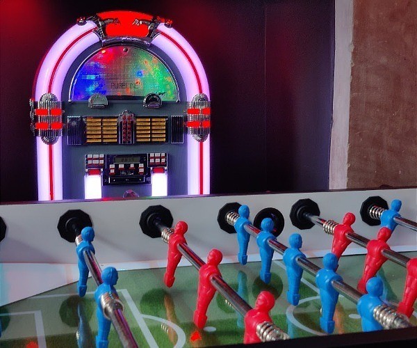 There’s also a games room, with a feature wall by a local graffiti artist depicting Her Majesty Queen Elizabeth II and the words ‘Cool Britannia’, offering a fun space to enjoy table football, air hockey and darts, as well as having a “jukebox” that can be connected to your phone via Bluetooth.
