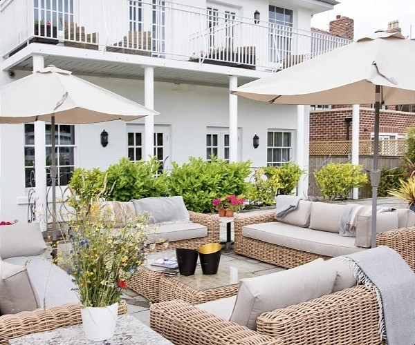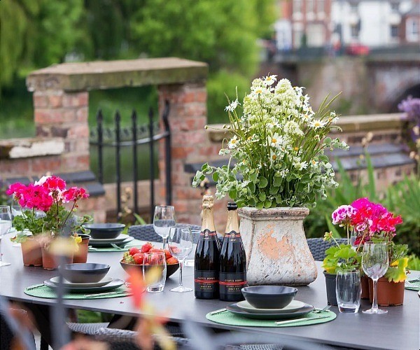 Outside, against the constant background soothing sound of the weir below, there are grassy and flagged areas in which to relax. An al freso dining area for 16, as well as some comfortable wicker loungers, each with large parasols, provide some wonderful outdoor social spaces.