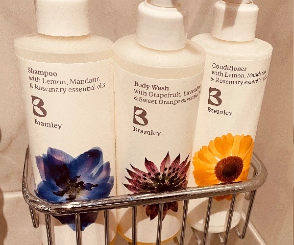 Toiletries are by Bramley. A lemon, mandarin and grapefruit shampoo epitomises the fresh floral notes.