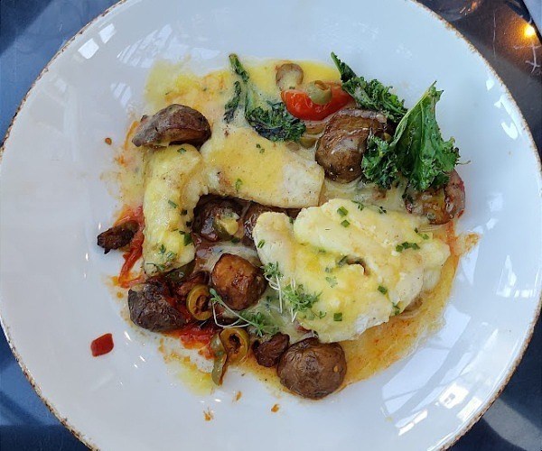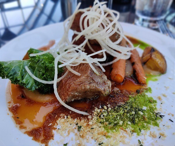 Meat eaters will love the grilled leg of lamb – served pink – with yellow beet purée, grilled yellow beet, rainbow carrots, herb crust, fondant potato, herb and date demi glace.