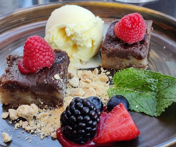 Sweet treats included this chocolate and caramel brownie served with vanilla ice cream and forest fruits.