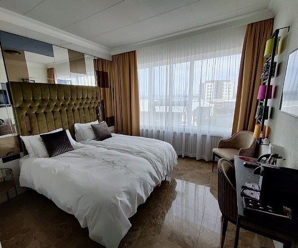 We arrived at Hotel Keflavik ahead of our return flight back to the UK for which we had a very early start. (The hotel is just a 6-minute drive from the airport.) The building actually houses two hotels, both under the same management – the four star Hotel Keflavik and, on the uppermost floor, Diamond Suites Luxury Boutique Hotel. Many of the facilities are common to both hotels. We are able to bring you details on both hotels since our sons stayed in a room at Hotel Keflavik, whilst we stayed in the Diamond Suites.