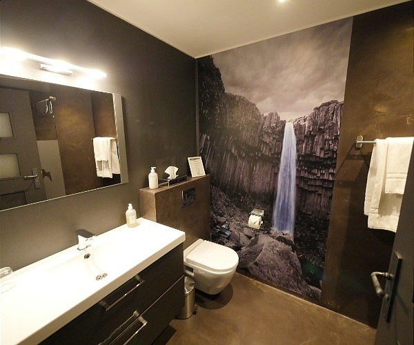 Whilst we had a bath in our room, we also had a separate bathroom with shower, basin and WC. A feature wall depicted one of Iceland’s many iconic waterfalls – Svartifoss in Vatnajökull National Park, I think it was – cascading over basalt columns.