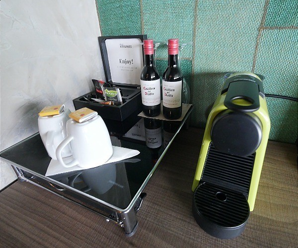 The suite has a separate seating area, some nested tables and a SmartTV with Netflix, Nespresso coffee machine and a tea maker.