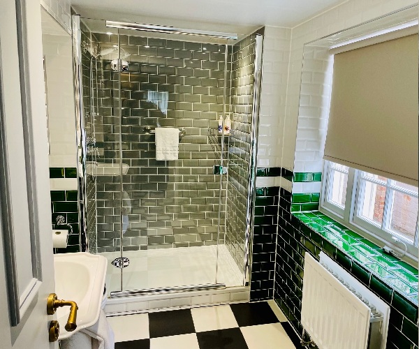 From our spacious room, French windows open out onto a small garden of table and two chairs, ideal for afternoon tea. Greys and teals are contemporary but black-and-white photographs of Stratford-upon-Avon provide a sense of place and history.