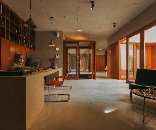 Converted from a former factory, the rooms are larger than those of the average hotel. Wide beds are mounted on a beech wood dias. Decor is post-industrial with raw sand-coloured walls above the polished concrete flooring.