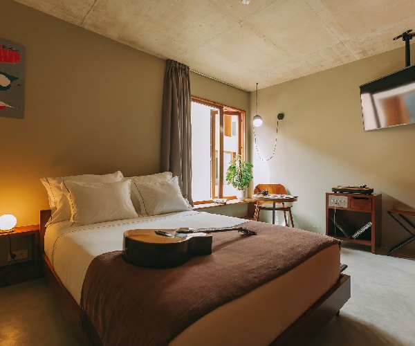 A key differentiator for M.Ou.Co. is the record deck in every room. No surprise that for a music hotel the sound-proofing is impeccable.