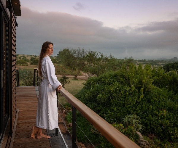 It is what is missing from our spacious room that makes it even more attractive. No mosquito nets. The Eastern Cape is malaria free. High winds and an absence of surface water keep the malaria-carrying mosquito species at bay. Light-wood doors and timbered ceiling give a ski-chalet feel to our room. Though tribal spear curtain rails and an Africa climate map remind us that this is Africa. Plus there’s a wraparound balcony for those views across the bush.