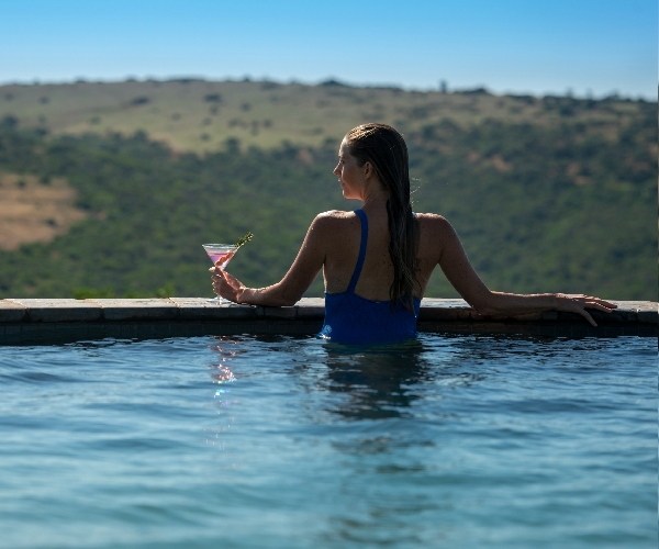 An outdoor swimming pool, overlooking the valley where a dazzle of zebra and impala roam, is one of the locations for lunch. A small swimming pool in the courtyard, next to the gym, is a favourite cooling off spot after a spell in the steam room.