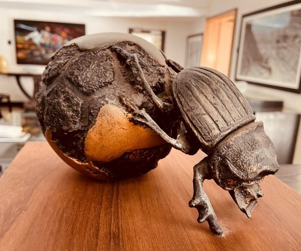 Again, the villa is an art gallery. Adrian Gardiner, a generous patron of the arts, bought a collection of Duncan Stewart’s presentation of the 2010 Football World Cup hosted by South Africa. Football stadia shaped as food bowls and a dung beetle pushing along a soccer ball pose interesting questions concerning spending choices prior to the World Cup.
