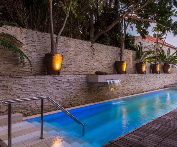 The garden, with a small swimming pool and sun-loungers, tranquilly creates the landscape of the Eastern Cape bushveld with rocks weighing up to four tons and planting of aloes, strelitzias, erythrina trees and cycads.