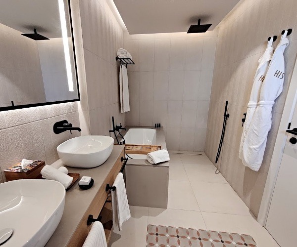 A luxurious Noken Porcelanosa patio bathroom holds further surprises, offering an excellent experience of comfort and relaxation. Fluffy bathrobes and a fabulous rain shower are just some of the amenities on offer.