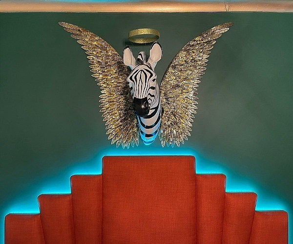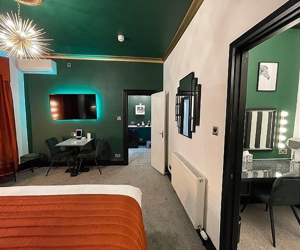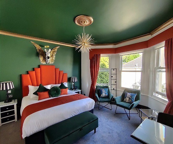 The Torre Suite covers 30 square metres and was newly re-furbished in 2022 in a funky Art Deco style. An entrance lobby leads into a large bedroom with an exceptionally comfortable super king sized bed, with all bedding sourced from the UK Fine Bedding Company. Despite the renovation, the room is still famously home to Frank the Zebra whose yellow sunglasses have been replaced with golden wings and a halo. Decadent midnight green feature walls contrast with a burnt orange bedspread and headboard (which can be backlit with mood lighting).