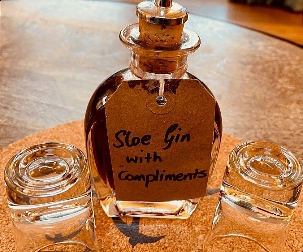 Complimentary wine chilling in the fridge and a decanter of sloe gin is ready to pour.