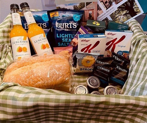 A welcome catering pack of bread, cereals, crisps, jam, orange juice and sachets of hot chocolate await us. Butter and milk are chilling in the fridge too.