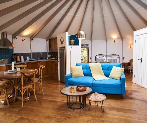 Open plan, under a domed yurt-style ceiling, the kitchen flows into the lounge and the lounge flows into the master bedroom. Sun ray wooden struts lead upwards to the glass centrepiece of a roof that gives views to the stars. Cream, green and flashes of arboreal brown make up the pastoral palette.