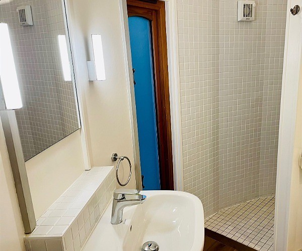 An ingenious design, following the external curving wall, helps keep water at the business end of the rainfall shower. Environmentally friendly toiletries are by Basic Earth.