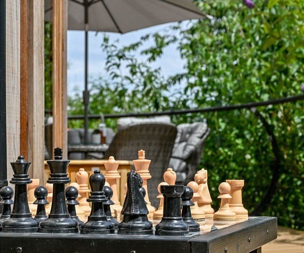 Next to the BBQ there is an al fresco dining table. Pride of place goes to a wood-heated hot-tub. More cerebrally, an outdoor, outsize chess set is set-up for play.