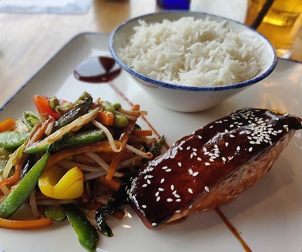 Grilled Teriyaki Slamon – served with Asian vegetables and steamed rice