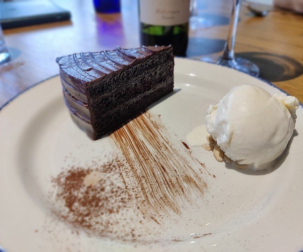We tended to forego dessert on all meals, content with a starter and main… however, temptation got the better of me on the last night of our stay thanks to the Old-Fashioned Chocolate Cake – a delightfully moist chocolate cake served with vanilla ice cream.