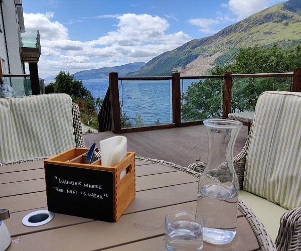 We arrived in the early afternoon and were advised on reception that the kitchen was open for lunch for another half hour. Since it was a lovely afternoon and the sun was shining, rather than checking in straight away, we opted instead for an al fresco lunch on the Lochside Brasserie’s expansive terrace, with heavenly views of Loch Lochy. It was glorious!
