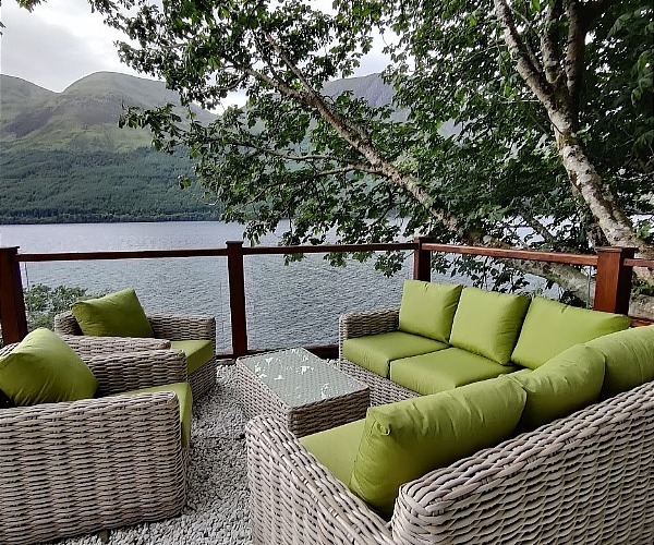 The room has large glass windows that let in lots of light and that open sideways to let in plenty of fresh mountain air, as well as a private balcony with scenic views of the glistening Loch Lochy and the pine forests beyond.