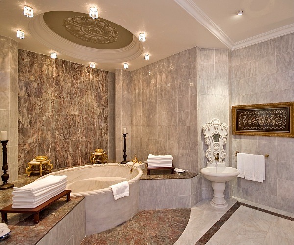 Entering the suite through a large hall, guests walk into a fancy living room with a dining area fit for 12 and will find two large bedrooms located on both sides of the dining room. A kitchenette is conveniently located on the right side of the entrance hall. The master bedroom has one of the suite’s most unique features: a handmade marble “hammam”, a Turkish bath with a private steam room and rain shower with gold plated and crystal bathtub faucets. The guest bedroom also has its own bathroom with a large window overlooking the stunning Bosphorus and historical peninsula.