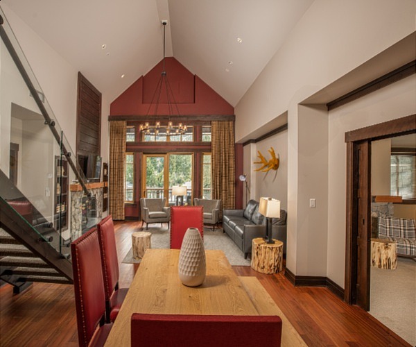 The interior design is inspired by a rustic cabin aesthetic, featuring deep reds, plaids and hand carved wooden furniture and art pieces.