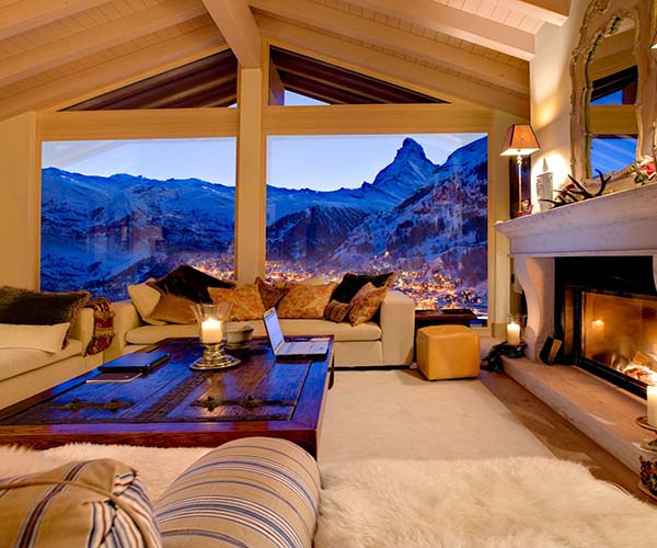 Quite frankly, who needs a cinema when you have the absolutely stunning panoramic views afforded from this beautiful chalet’s lounge area. The chalet was positioned in such a way that if you lounge on the huge comfy sofas in the living area you have a cinematic view, in wide screen, and there she is, the Matterhorn, in all her glory, seemingly just for you. Pour a glass of wine and all you have to do is look out and appreciate it all, it’s stunning and you have a front row seat. Your own film and it’s a Blockbuster. Search Michael e on Spotify for the perfect soundtrack. Just about every piece of prime real-estate across the globe has a million dollar view, Grace is no exception. Floor to ceiling windows on all three levels allow for awe inspired daydreaming.